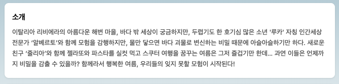 바다에 사는 일명 '바다 괴물'인 주인공 루카가 인간 세상에 나와 새로운 경험을 하고 성장해 나가는 그런 이야기다. 인간들이 바다 괴물이라고 부르는 루카의 종족(?)은 육지로 나와서 물이 마르면 인간의 모습으로 변한다. (수영을 못하는 나로서는 매우 부러운 설정이었다.)