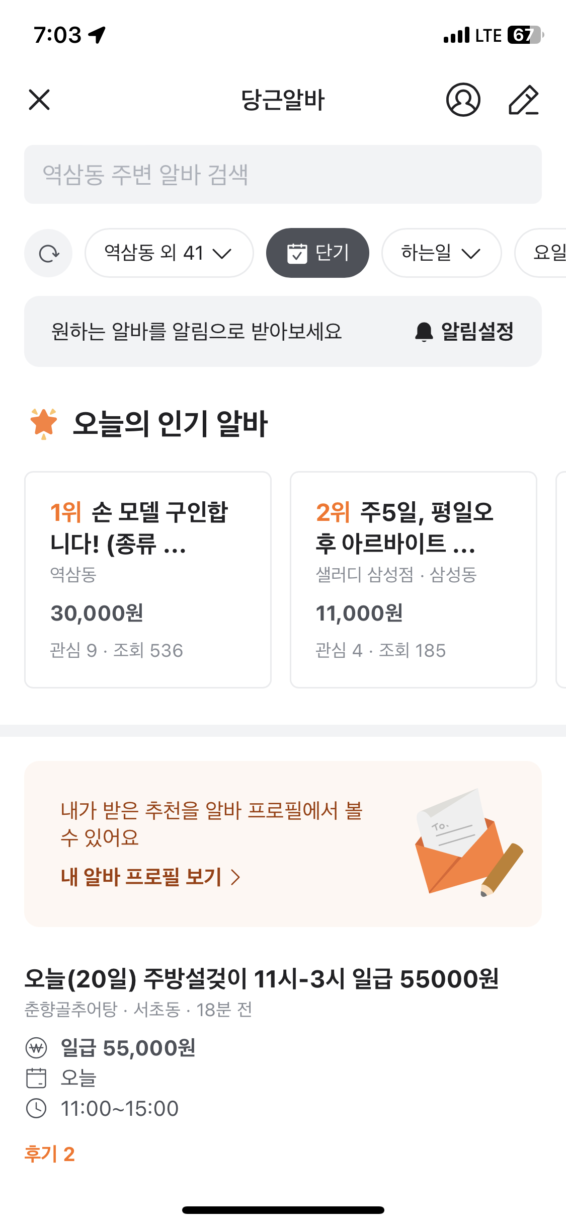 우리 집 근처 위주의 아르바이트를 편하게 둘러볼 수 있는 장점이 있다. 다른 알바 찾는 서비스처럼 요일, 단기, 업종 등 필터를 설정할 수도 있다.