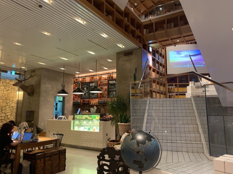 1층은 카페가 메인! 여행지도랑 책도 조금 있다.
