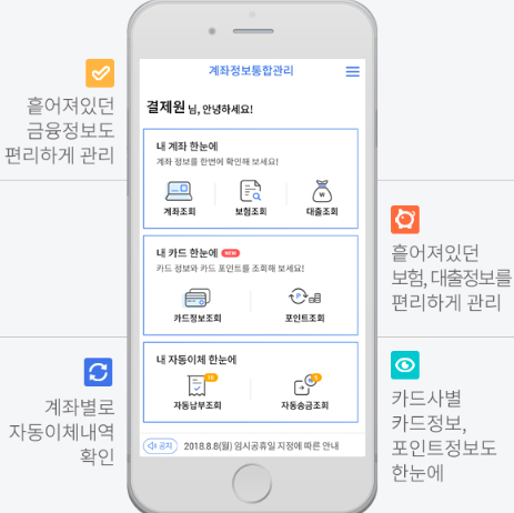 사이트에 정리된 어카운트인포 어플의 편리한 계좌정보통합관리 서비스를 살펴보면 아래와 같다.