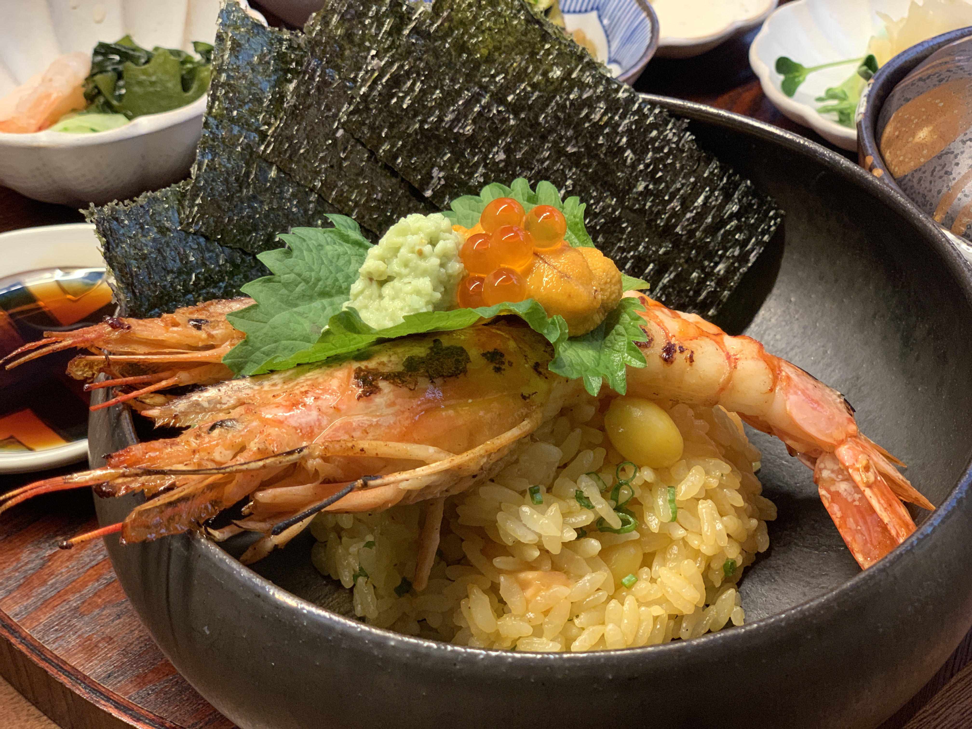 이것은 친구가 주문한 새우 버터구이 우니동 정식. 대하 두 마리와 버터로 비벼진 밥 위에 우니가 얹어져 있다.