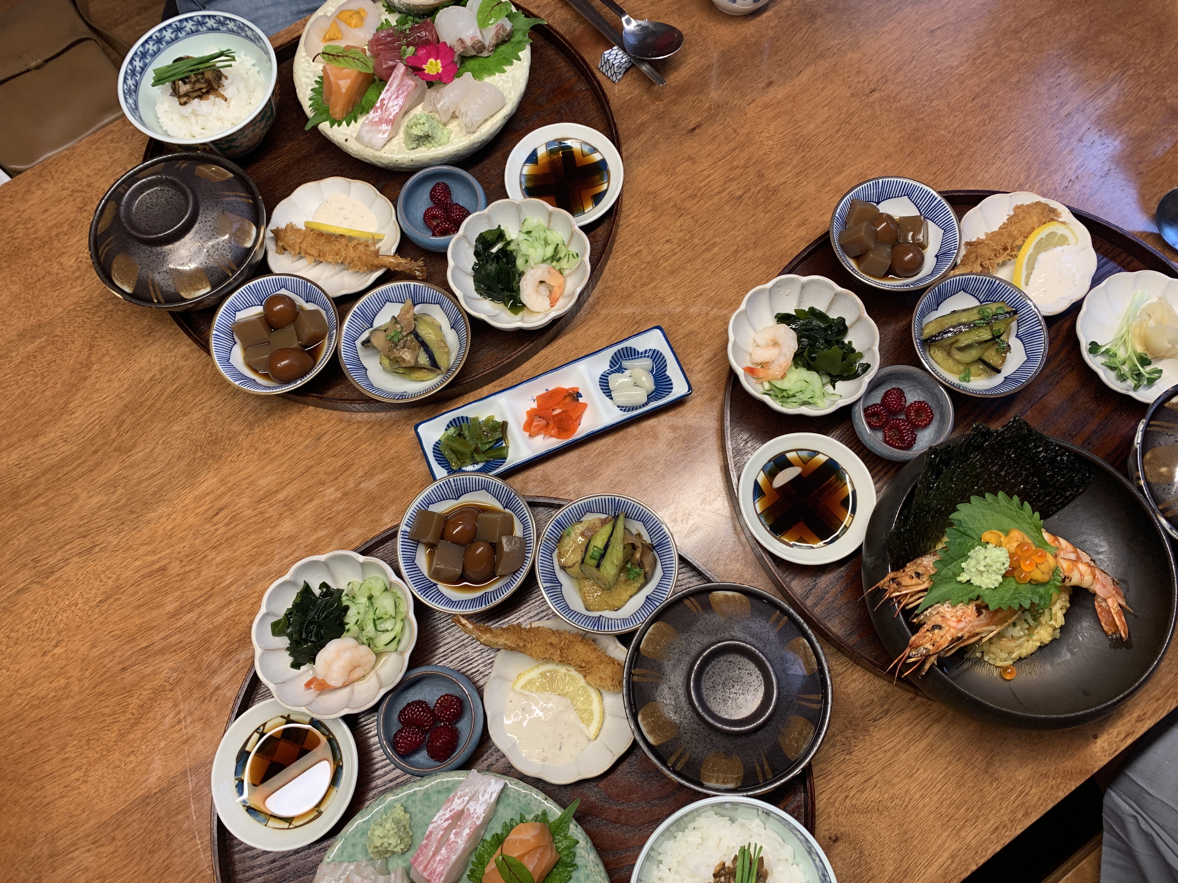 주문한 메뉴 등장. 해산물 스프는 이미 에피타이저 처럼 나왔다 간 뒤라 흔적도 없이 사라졌다. 계란말이 대신 새우튀김이 나온건가? 곤약 메추리알 장조림은 적당히 달달해서 맛있었고, 미소 가지볶음이 진짜 진짜 맛있었다. 밑반찬 중에 최고의 메뉴였다.