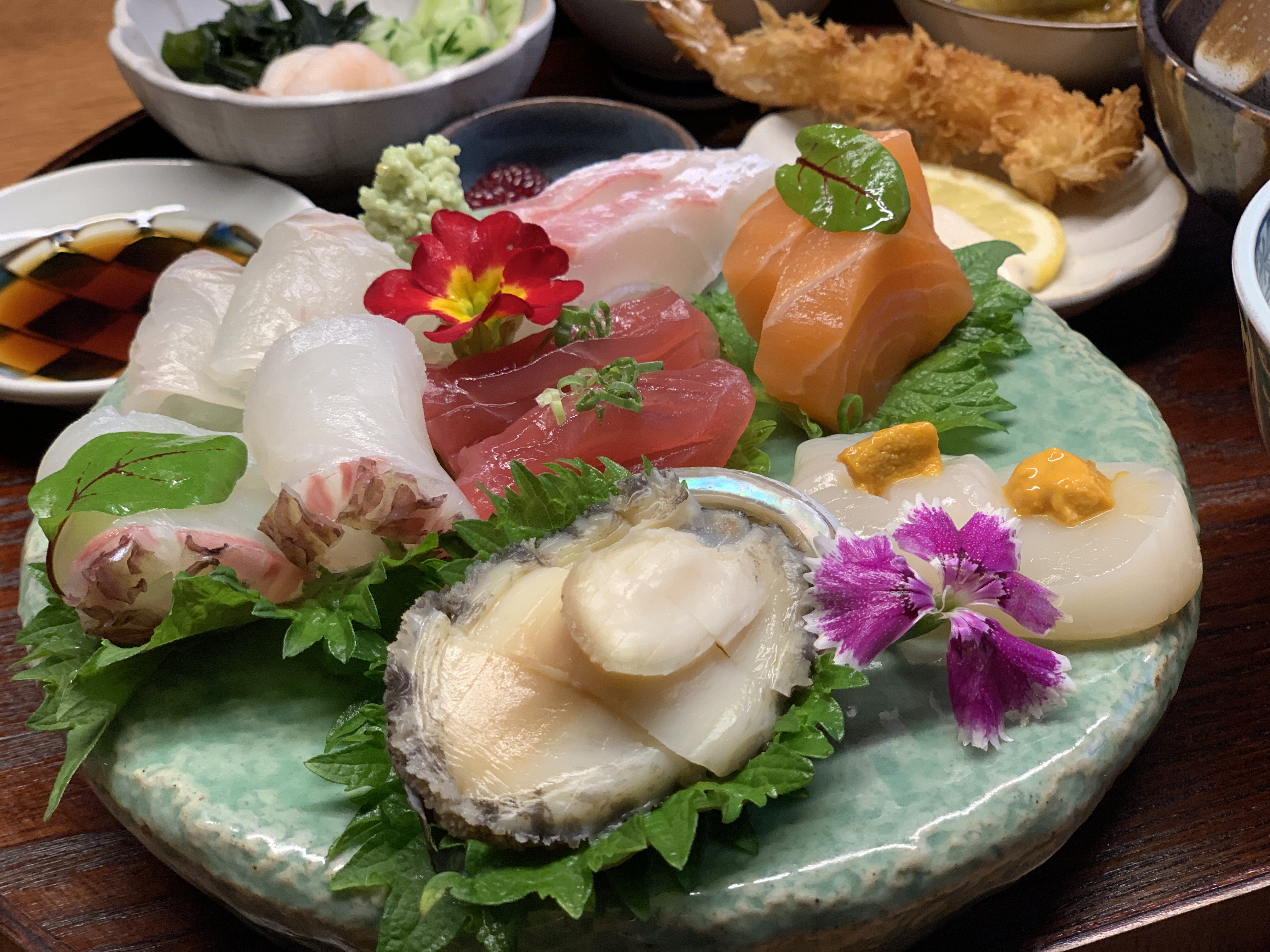 내가 주문한 모둠 사시미 정식. 참치, 연어, 전복, 관자&우니, 광어, 잘 모르겠는 두 생선이 나왔다. 밥 위에는 양념한 버섯이 송송 올라와 있었다. 사시미는 싱싱하니 다 맛있었는데 개인적으로 참치가 좀 아쉬웠다. 내가 상상한 기름진 참치의 느낌은 아니었다.