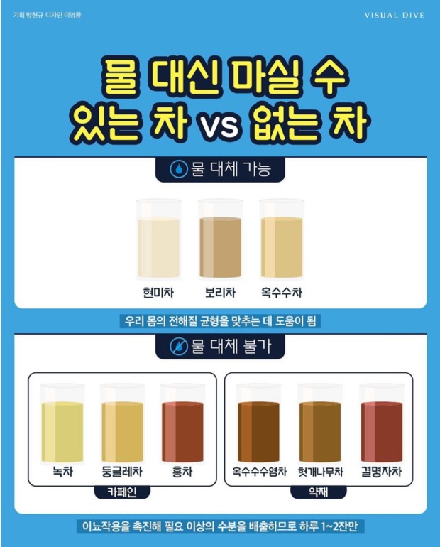 이 6가지 차들은 모두 필요 이상의 수분을 배출하므로 마시고 싶다면 하루 1~2잔만 마시는 것이 좋고, 카페인에 민감한 사람이라면 이보다 더 적게 마시는 것을 권장한다. 헷갈리지 말아야 할 것은 옥수수차는 물 대신 마셔도 되지만, 옥수수수염차는 안된다는 것. 앞서 이야기한 내용을 친절하게 이미지로 정리해놓은 것이 있어 함께 첨부한다. 저장해놓고 이 차 물 대신 마셔도 되나 하고 궁금할 때 보면 좋을 것 같다.