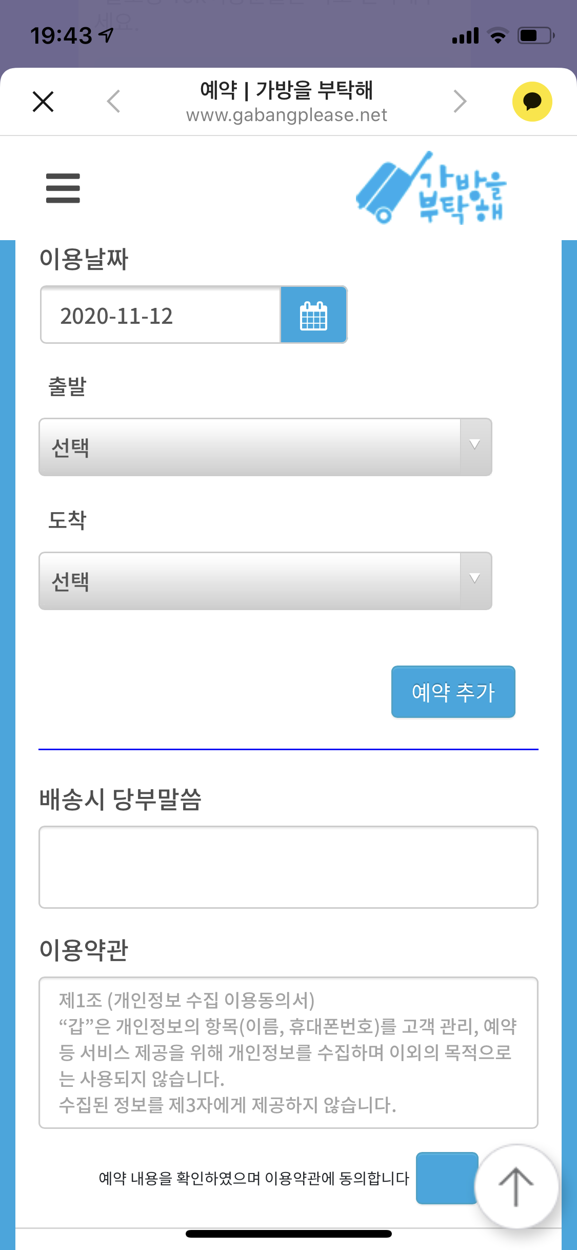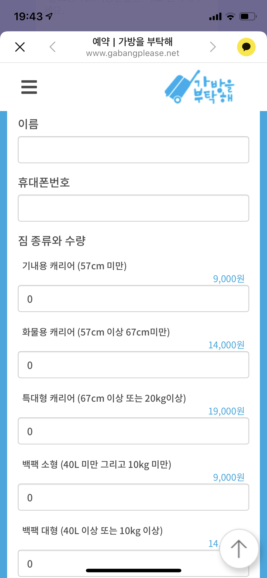이름, 휴대폰 번호, 짐 수량 입력 후