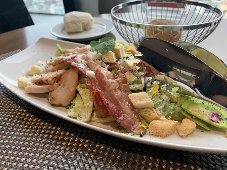 훈제 치킨을 곁들인 아보카도 시저 샐러드가