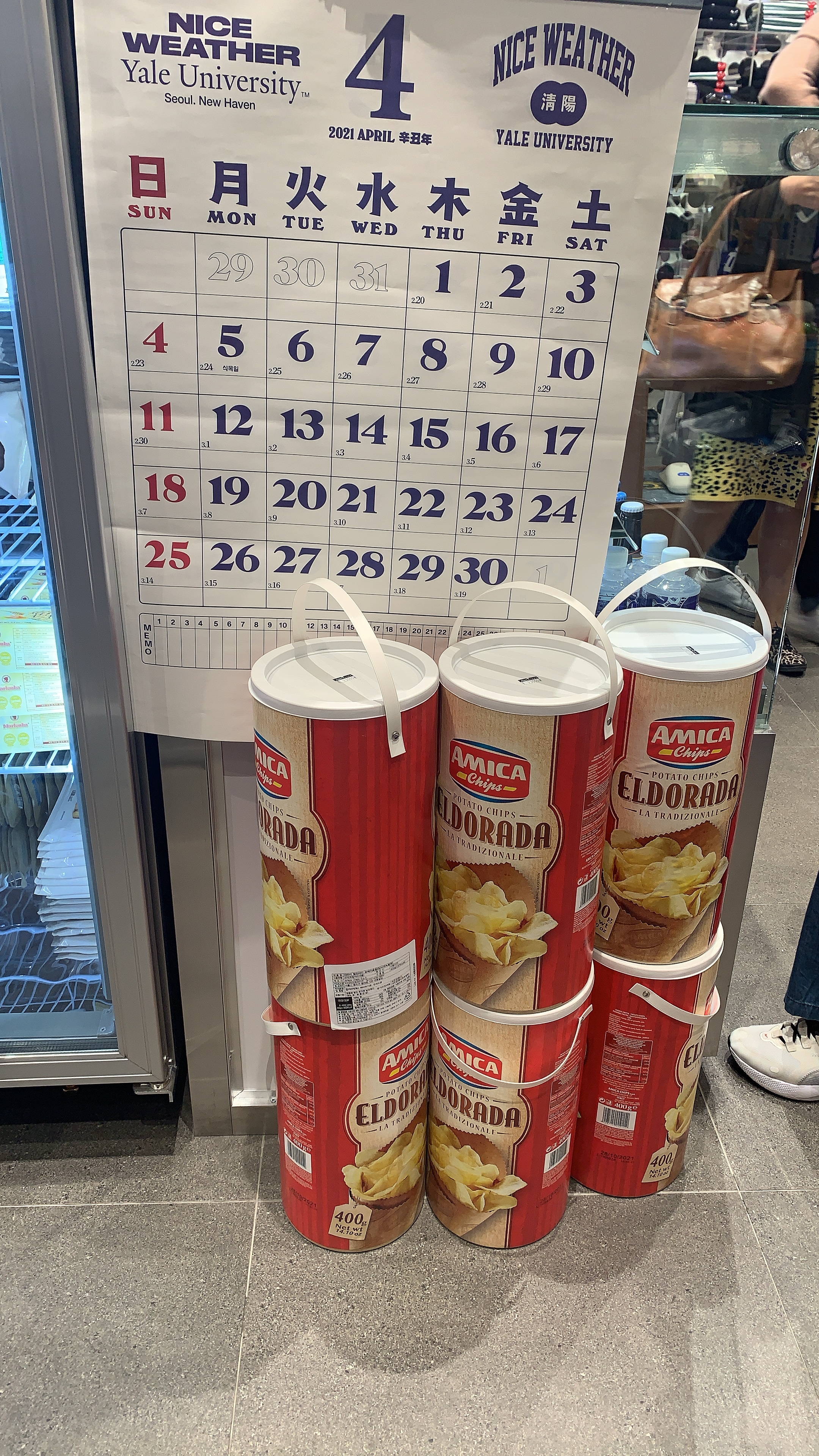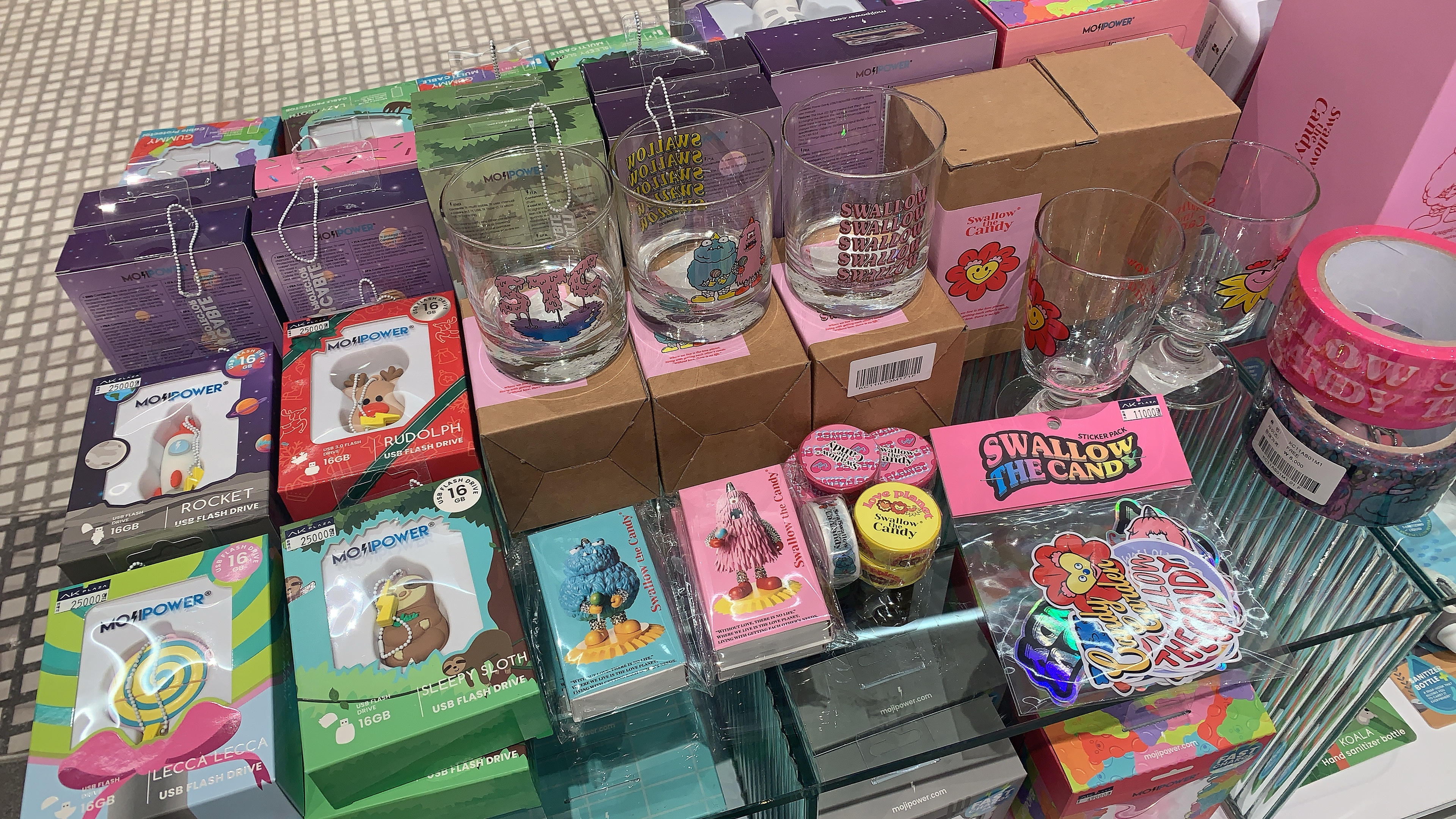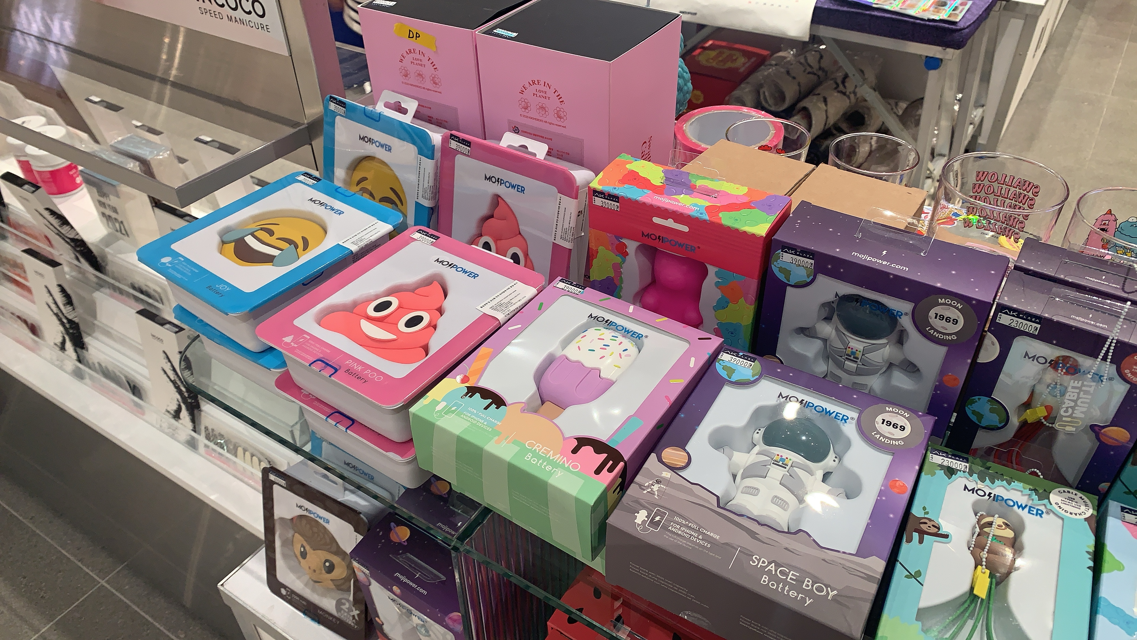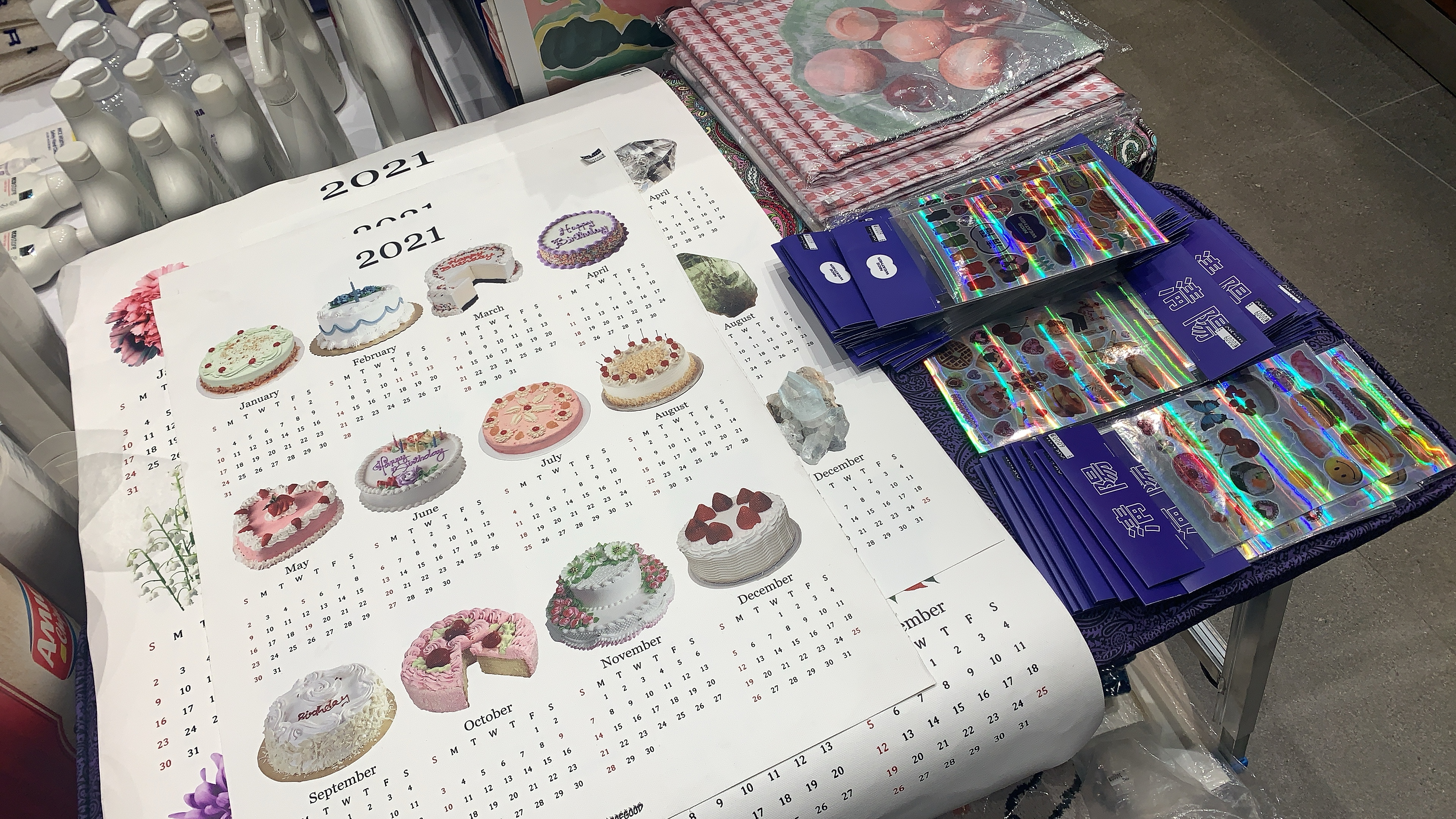 보조배터리, USB 같은 캐릭터 상품이랑 향초도 있다. 우측 아래에 있는건 SNS에서 많이 본 나이스웨더 달력. 케이크들이 막 들어가 있다. 뭔가 전반적으로 레트로 느낌이 나고 있었다.