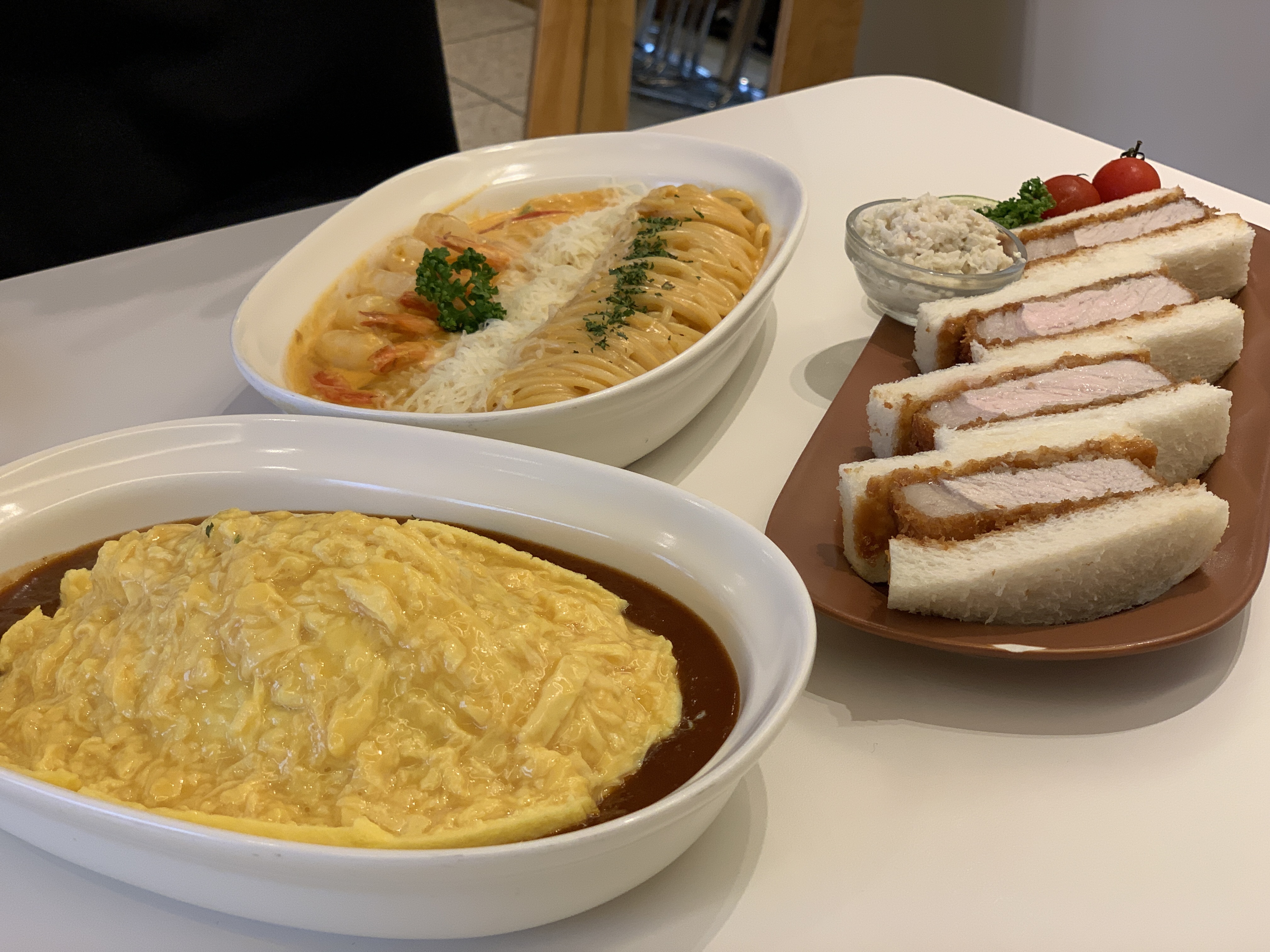그렇게 진지하게 고른 메뉴는 카츠산도 (9,900원) / 낙원오믈렛 (11,900원) / 쉬림프 오이스터 (11,900원) 3가지 였다. 둘이 가서 오믈렛과 파스타만 시키려고 했는데 카츠산도는 왠지 먹어봐야 할 것만 같고.. 입가심같아 보여서 양도 적당할 것 같고.. 그래서 3개 다 시켰다.
